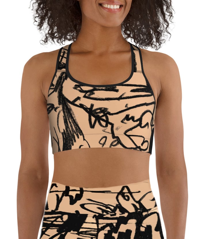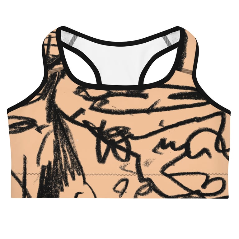 82% polyester, 18% spandex. Moisture-wicking, four-way stretch fabric. Scoop neckline and racerback. Best for A–C cups. Support material in the shoulder straps, double-layered front, and a wide elastic band for extra support.
